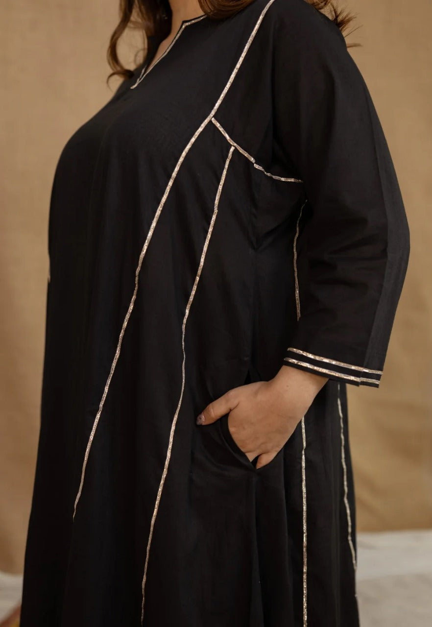 This Jet Black kurta features delicate golden detailing and flowing chiffon sleeves that add a touch of ethereal grace. The soft and breathable fabric ensures all-day comfort, while the classic silhouette is perfect for festive occasions, intimate gatherings, or cultural celebrations. Pair it with statement earrings and heels for a look that exudes effortless sophistication."