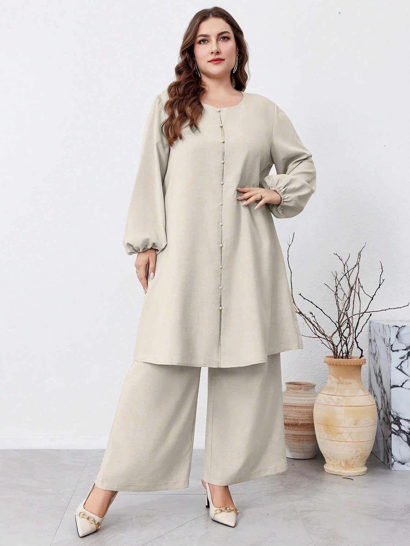 "Elevate your wardrobe with our [Product Name], a perfect blend of modern minimalism and classic sophistication. This chic two-piece set features a gracefully tailored long tunic with delicate button details and airy, wide-leg pants, crafted from soft, high-quality fabric in a timeless beige hue. The outfit's understated design ensures versatility, making it ideal for work, casual outings, or formal occasions. Style it with elegant accessories and heels to complete your effortlessly refined look."