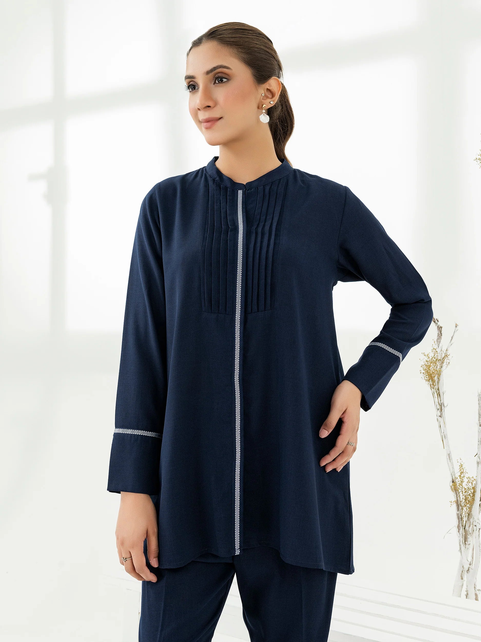Step into effortless sophistication with our Midnight Grace Co-Ord, a perfect blend of comfort and elegance. Crafted from a soft, breathable fabric, this two-piece outfit features a long navy-blue tunic with intricate pleated detailing on the front, adding a touch of refined texture. The subtle contrast stitching along the sleeves and zipper front further enhances its modern appeal.
