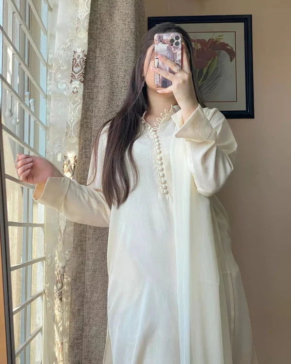 Design: The long shirt features a timeless silhouette suitable for various occasions. The accompanying chiffon dupatta, edged with delicate lace, adds a touch of sophistication.